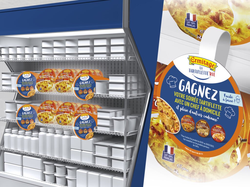 Nous avons scénarisé la présence d’Ermitage en magasin à travers un dispositif centré sur la recette, en mettant la tartiflette au cœur du parcours shopper.